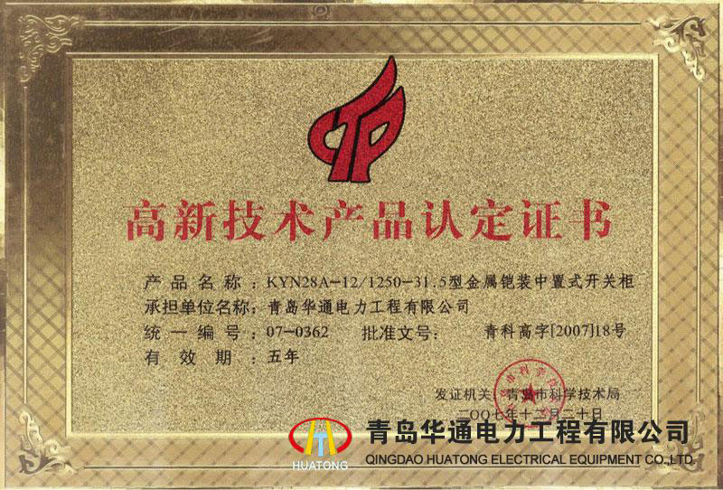 YBM-12高壓/低壓預(yù)裝式變電站高新技術(shù)產(chǎn)品認定證書